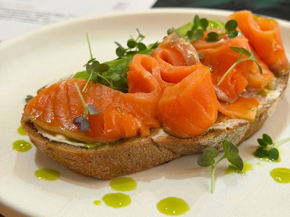 Закуска, которая сочетает хрустящий поджаренный хлеб с начинкой из слабосолёного лосося и спелого манго