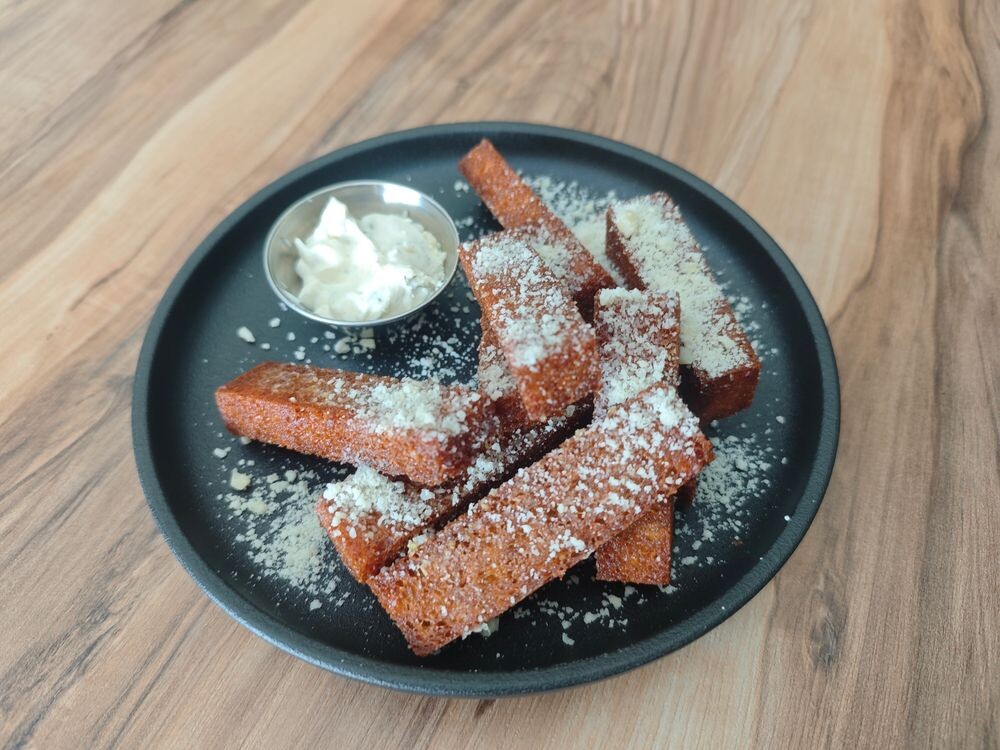 Хрустящие кусочки хлеба, посыпанные тёртым сыром пармезан