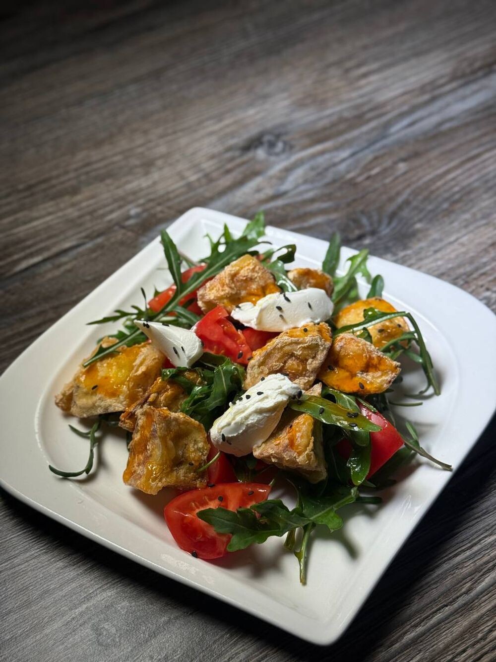 Баклажаны, микс салата, помидоры черри, соус чили-манго, сливочный сыр, кунжут