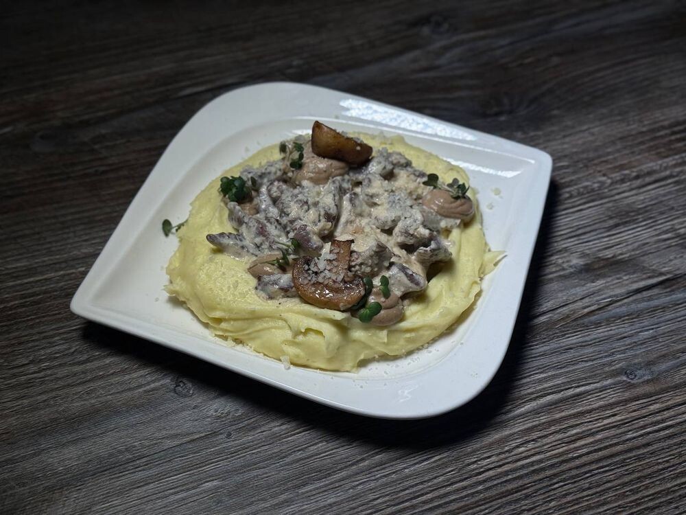 Блюдо, сочетающее нежное мясо, грибы и сливочный соус в сочетании с картофельным пюре