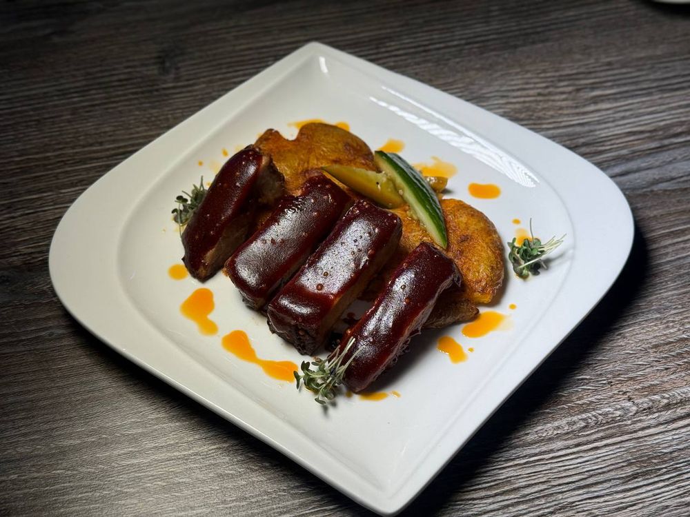 Блюдо, в котором мясо, приготовленное с использованием соуса барбекю, сочетается с запечённым картофелем в качестве гарнира