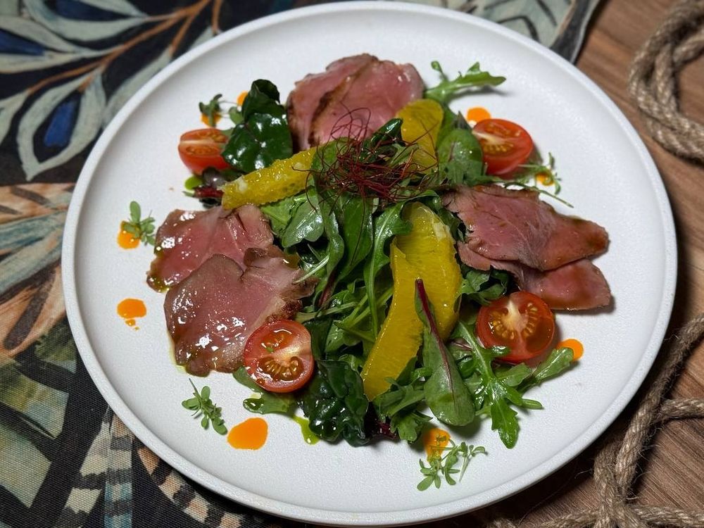 Утка, апельсин, микс салата, черри, цитрусовая заправка