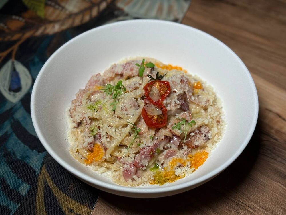 Итальянское блюдо, которое сочетает пасту, бекон и яично-сырный соус